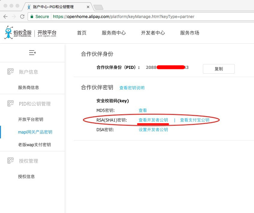4. APP支付 签约审核通过后,进入 mapi网关产品密钥 设置页面,点击直接进入 https://openhome.alipay.com/platform/keyManage.htm?keyType=partner