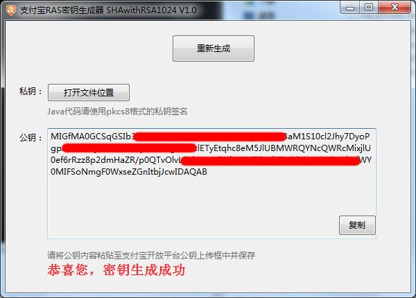 7. 解压下载的文件,直接运行“支付宝RAS密钥生成器SHAwithRSA1024_V1.0.bat”(WINDOWS)或“SHAwithRSA1024_V1.0.command”(MACOSX),点击“生成RSA密钥 或 重新生成”,会自动生成公私钥。