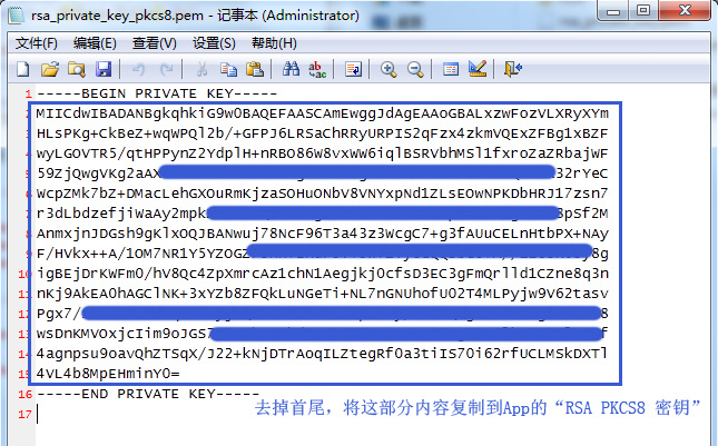 8. 点击“打开文件位置”,用文本编辑器(如记事本)打开工具自动生成的 rsa_private_key_pkcs8.pem 密钥文件,将 -----BEGIN PRIVATE KEY----- 与 -----END PRIVATE KEY----- 之间的字符复制粘贴到APP支付宝配置的 RSA PKCS8 私钥 处。注意,一定要用 pkcs8 文件,并去掉带横线的首尾。。