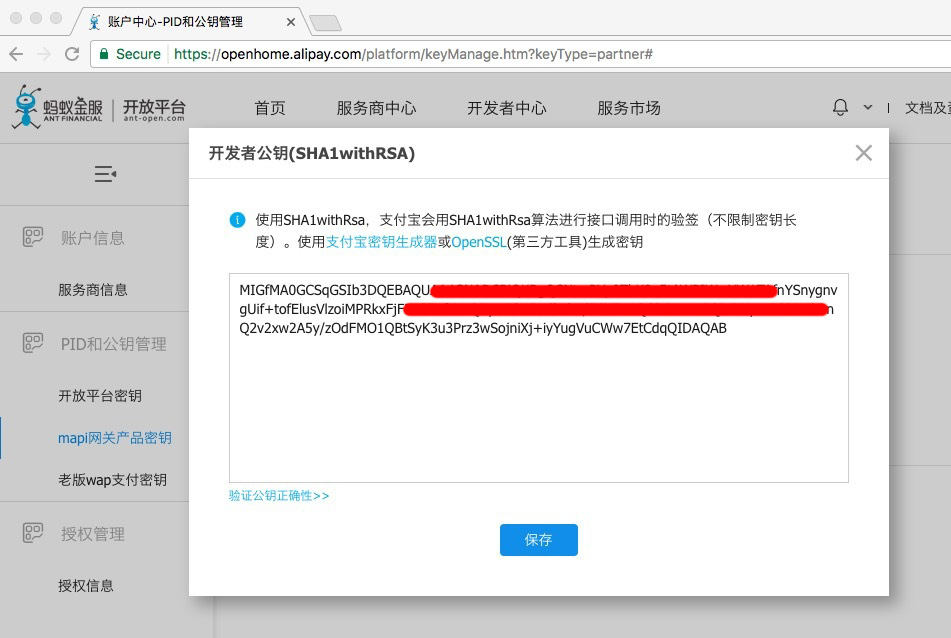 9. 回到支付宝开放平台页面,点 设置开发者公钥 或 查看开发者公钥,将第 5 步生成的 公钥 保存到开放平台。