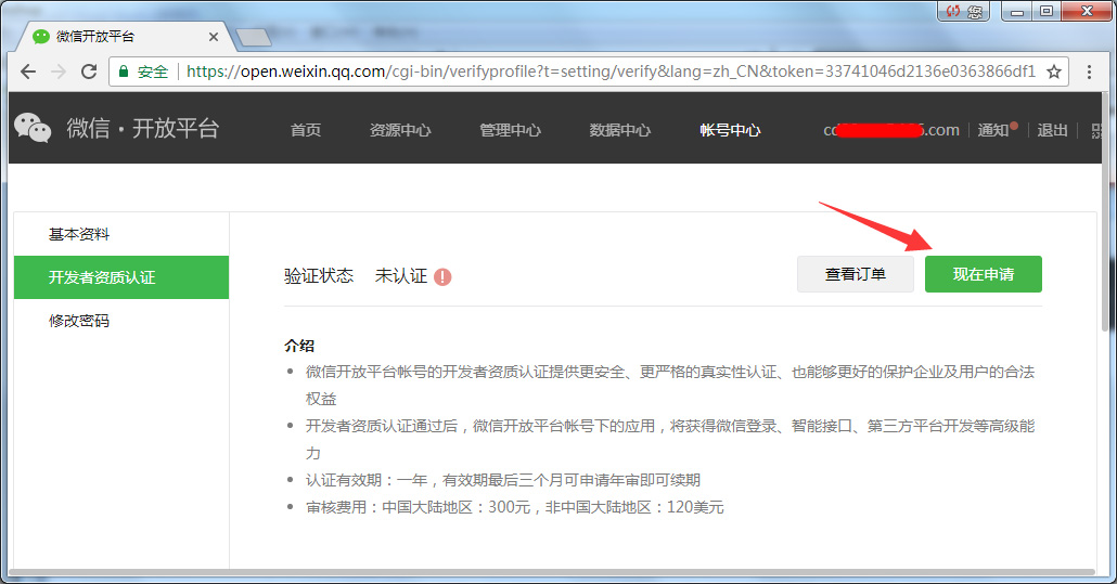 2. 点击 账号中心 - 开发者资质认证 交300元给腾讯,提交资料审核成为微信开放平台认证账号。认证账号申请的 移动应用 自动拥有微信登录权限,可申请微信支付;非认证账号仅拥有微信分享功能,无微信登录权限,不可申请微信支付。
